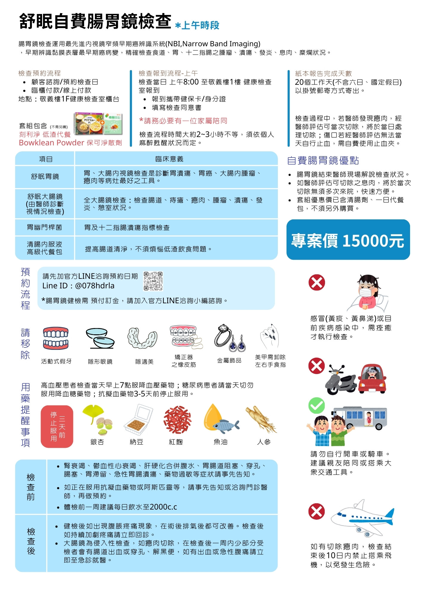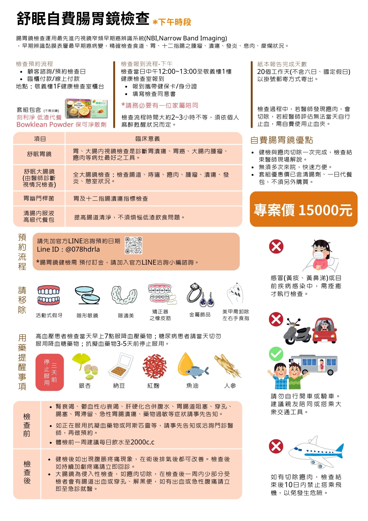 提供清腸內服液,以提高腸道清淨。 檢前搭配高級代餐,不須煩惱低渣飲食問題。 |