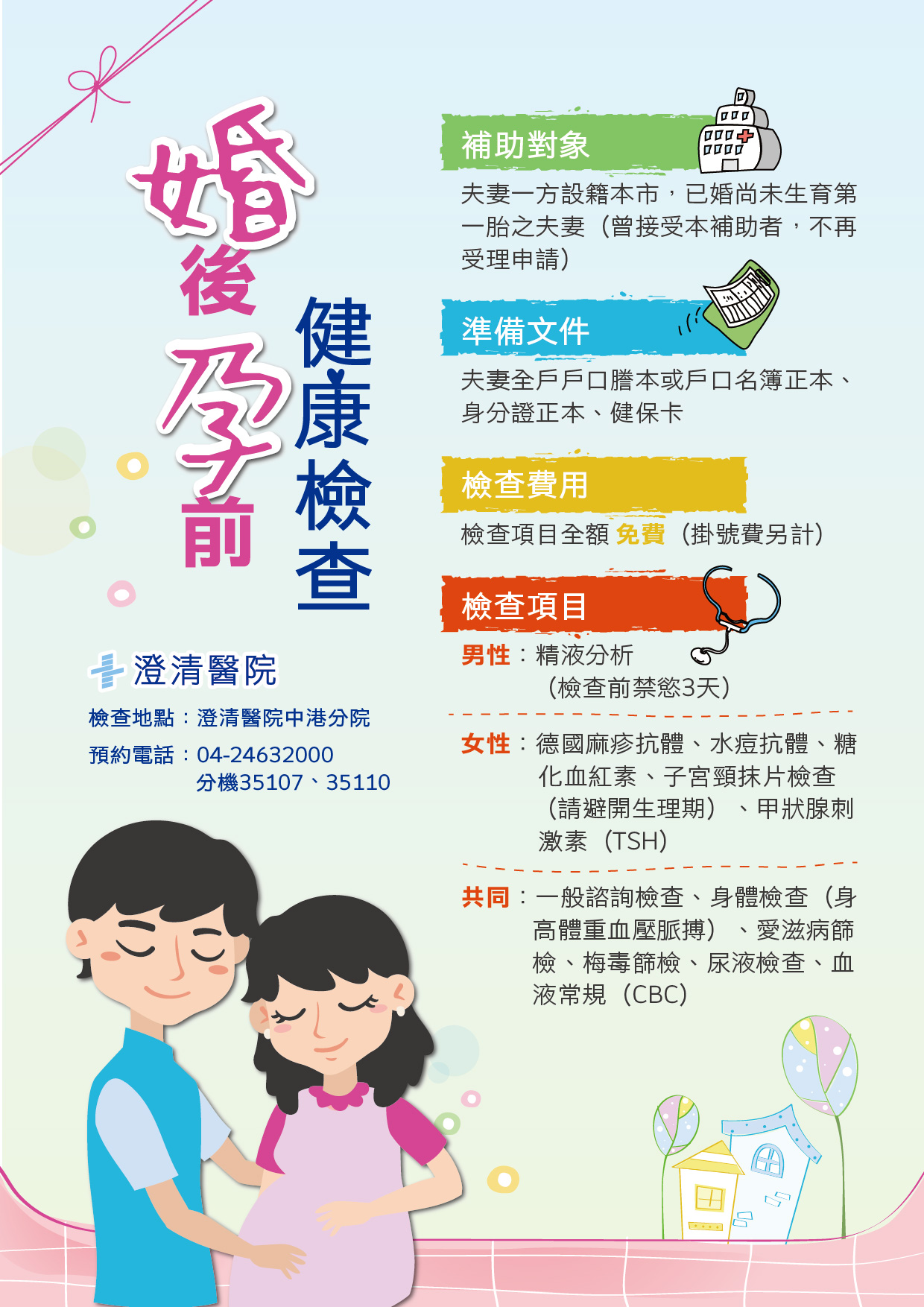 本院承辦臺中市政府衛生局婚後孕前健康檢查補助計畫,