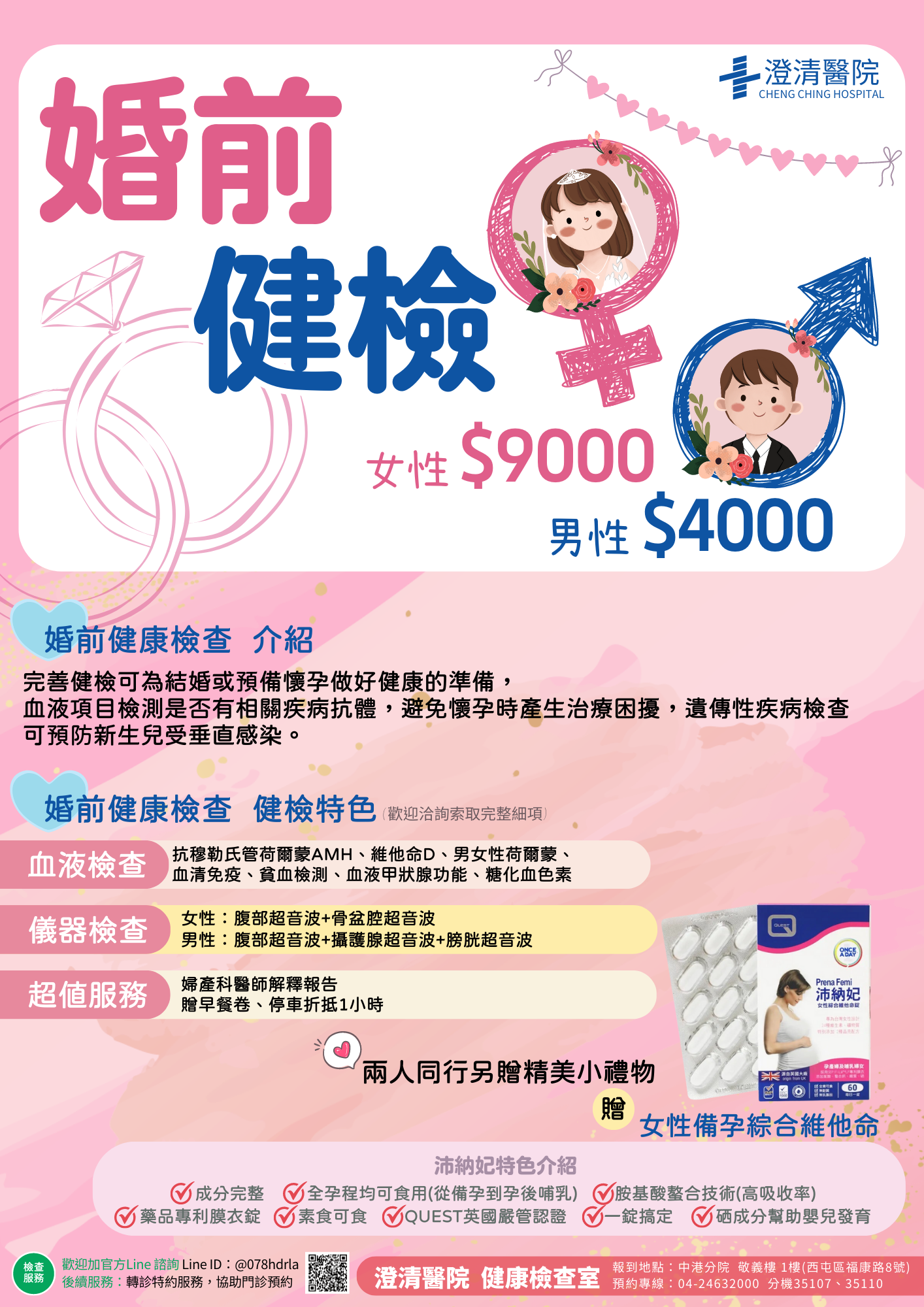 *婚前/婚後健檢實際可預約日期需配合其他單位排程,歡迎加官方Line或來電洽詢可預約日期/時段